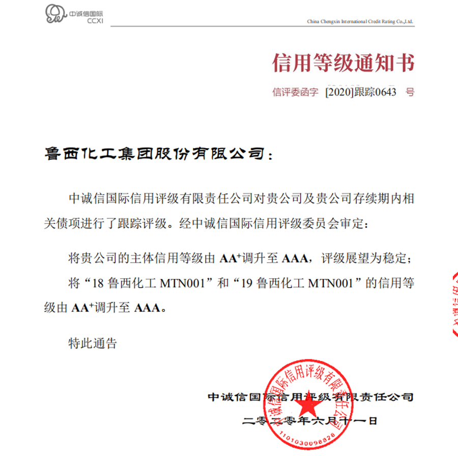6月11日,中誠信國際信用評級有限公司出具最新評級報告,將魯西化工集團股份有限公司的主體信用等級由 AA + 調升至 AAA,評級展望為穩(wěn)定。